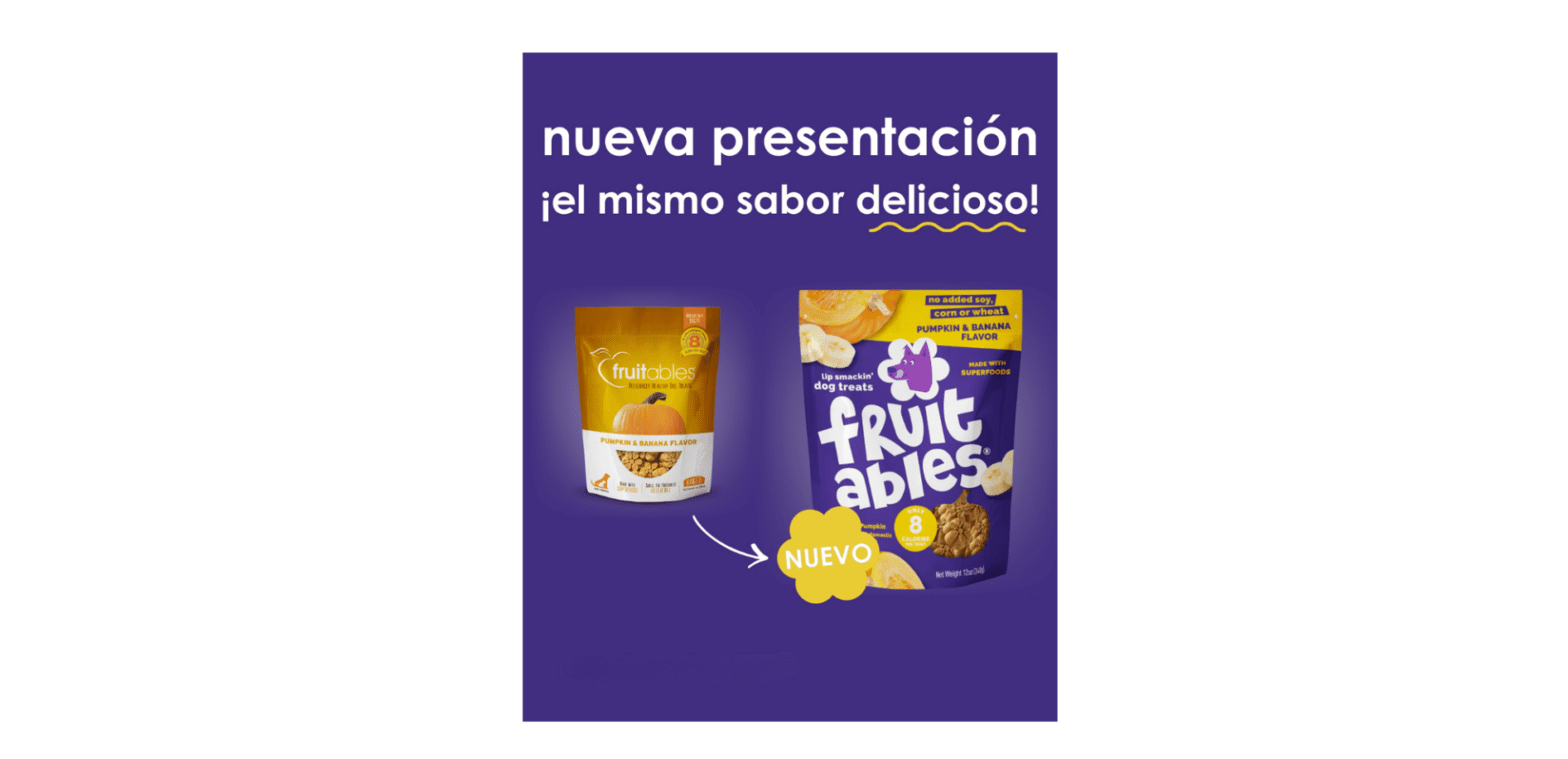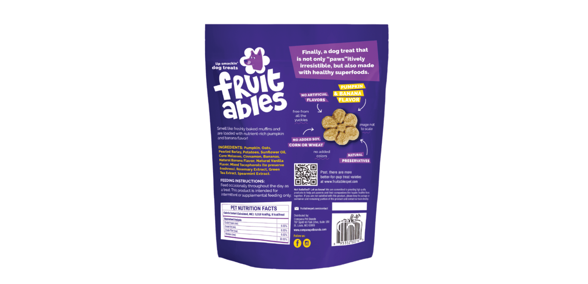 ¡Amante del horno! Esta receta combina calabaza, bananos cremosos y canela con un delicioso sabor recién horneado que su perro adorará. ¡Abre una bolsa hoy y huele la diferencia de Fruitables!